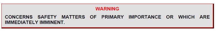 Concerns safety matters of secondary importance or which are not immediately imminent. ![]() CONCERNS SAFETY MATTERS OF PRIMARY IMPORTANCE OR WHICH ARE IMMEDIATELY IMMINENT. 在灣流手冊中,是這樣定義的:Warnings, Cautions and Notes: Used throughout this manual, these adjuncts highlight and emphasize certain points, and are not to be confused with Engine Instruments and Crew Alerting System (EICAS) messages. Shown below, each is explained in the style it will appear in this manual: ![]() CALLS ATTENTION TO THE USE OF MATERIALS, PROCESSES, METHODS, PROCEDURES OR LIMITS WHICH MUST BE PRECISELY FOLLOWED TO AVOID PERSONAL INJURY OR LOSS OF LIFE. |