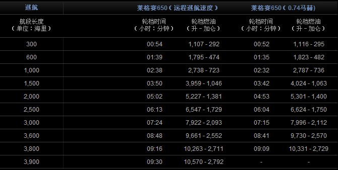 輪擋時(shí)間及輪擋燃油 4名乘客,2名駕駛員,每人以200磅(91公斤)計(jì),國際標(biāo)準(zhǔn)大氣,無風(fēng),符合NBAA IFR規(guī)定的備份燃油條件。(200海里備降距離)。起飛條件:海平面、國際標(biāo)準(zhǔn)大氣、最佳起飛重量 最大使用速度