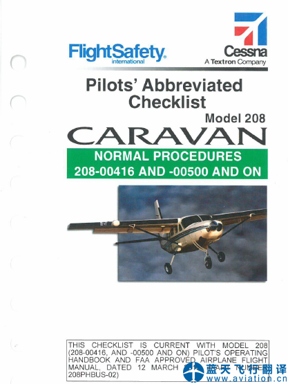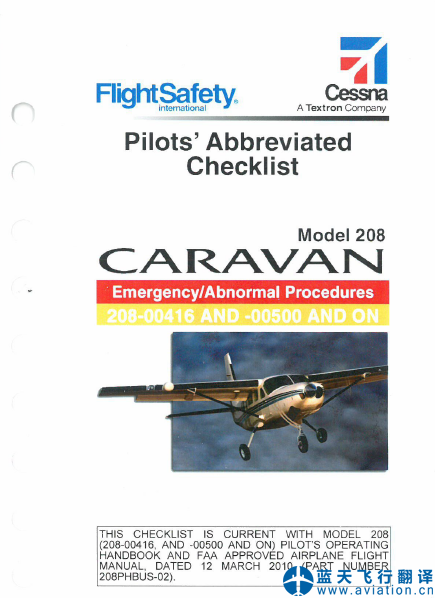 北京藍(lán)天飛行翻譯公司承接大型通航公司的塞斯納208簡(jiǎn)易檢查單翻譯任務(wù),塞斯納208簡(jiǎn)易檢查單包含有正常程序和應(yīng)急/非正常程序,Cessna 208 CARAVAN Pilots’ Abbreviated Checklist Translation ![]() 塞斯納208簡(jiǎn)易檢查單正常程序 Cessna 208 CARAVAN Pilots’ Abbreviated Checklist NORMAL PROCEDURES ![]() 塞斯納208簡(jiǎn)易檢查單應(yīng)急/非正常程序 Cessna 208 CARAVAN Pilots’ Abbreviated Checklist Emergency/Abnormal Procedures 塞斯納208簡(jiǎn)易檢查單(Cessna 208 Pilots’ Abbreviated Checklist)的主要內(nèi)容包含有: NORMAL PROCEDURES |