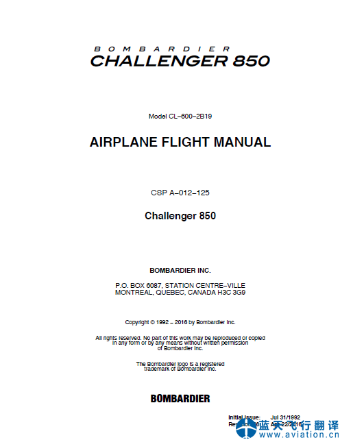 北京藍(lán)天飛行翻譯公司完成大型公務(wù)機(jī)公司龐巴迪挑戰(zhàn)者850飛機(jī)飛行手冊(cè)翻譯任務(wù) BOMBARDIER Challenger 850 AIRPLANE FLIGHT MANUAL Translation ![]() 龐巴迪挑戰(zhàn)者850飛機(jī)飛行手冊(cè) BOMBARDIER Challenger 850 AIRPLANE FLIGHT MANUAL |