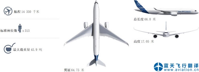 空中客車 A350-800 尺寸 總長(zhǎng)度 60.54 米 客艙長(zhǎng)度 -- 機(jī)身寬度 5.96 米 最大客艙寬度 5.61 米 翼展(幾何體) 64.75 米 高度 17.05 米 輪距 10.60 米 輪軸距 24.86 米 容量