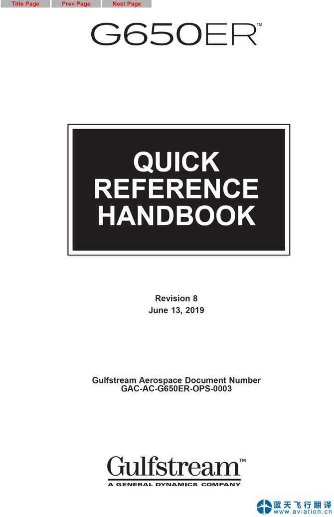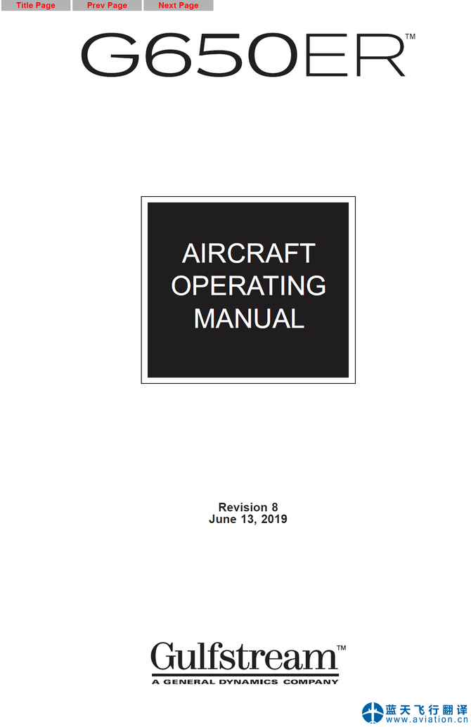 北京藍天飛行翻譯有限公司完成2019年6月13日版本灣流G650ER飛機操作手冊、快速檢查單和飛機飛行手冊翻譯任務 Revision 8 June 13, 2019 G650ER AIRCRAFT OPERATING MANUAL, G650ER QUICK REFERENCE HANDBOOK and G650ER AIRPLANE FLIGHT MANUAL Translation