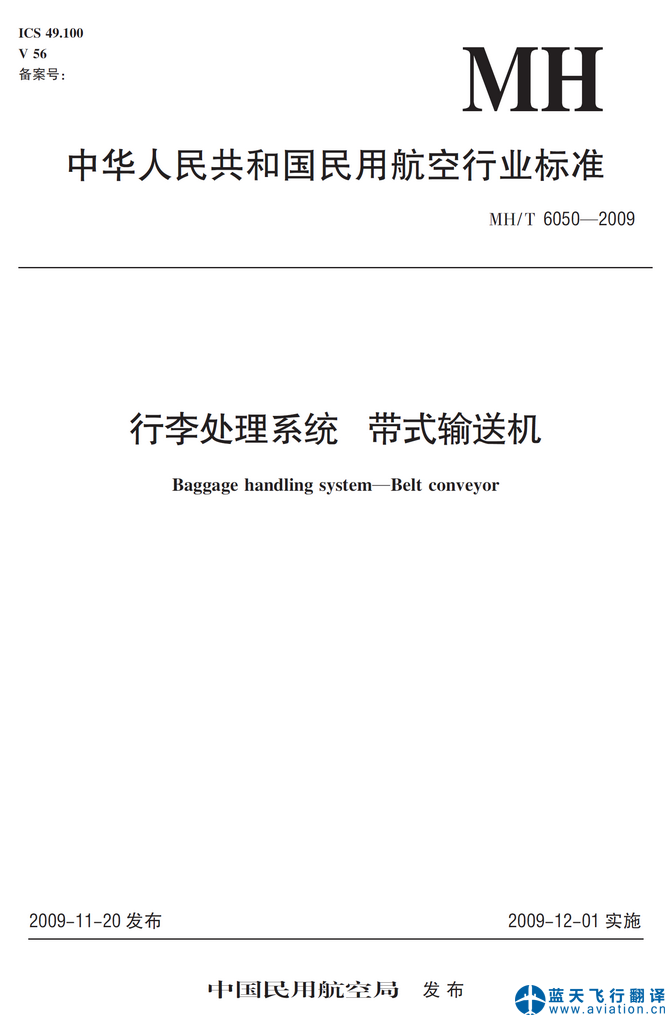 北京藍天飛行翻譯有限公司承接中華人民共和國民用航空行業(yè)標準行李處理系統(tǒng)帶式輸送機翻譯任務 MH/T 6050—2009 行李處理系統(tǒng)帶式輸送機 Baggage Handling System—Belt Conveyor, Civil Aviation Industrial Standard Translation
