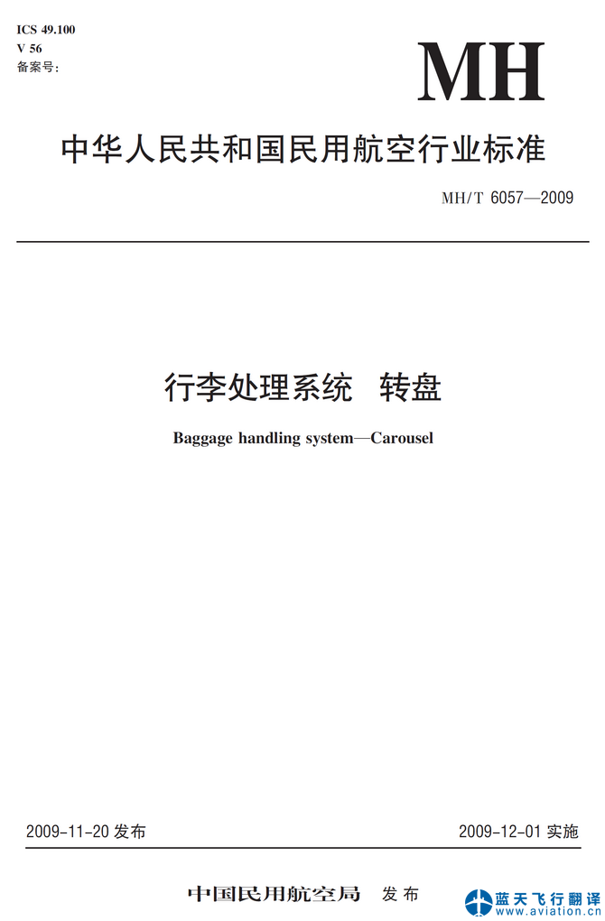 北京藍天飛行翻譯公司承接中國民用航空局發(fā)布的中華人民共和國民用航空行業(yè)標準行李處理系統轉盤翻譯任務 Baggage handling system—Carousel, Civil Aviation Industrial Standard Translation![]() 中華人民共和國民用航空行業(yè)標準行李處理系統轉盤 中華人民共和國民用航空行業(yè)標準行李處理系統轉盤(Baggage handling system—Carousel)的主要內容包含有: