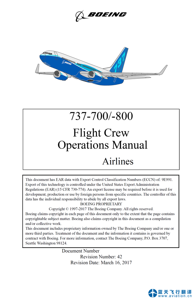 北京藍(lán)天飛行翻譯公司本次翻譯的波音737NG飛行機(jī)組使用手冊(cè)(Flight Crew Operations Manual)版本日期為2017年3月16日,包含157架波音737-700/-800飛機(jī)。