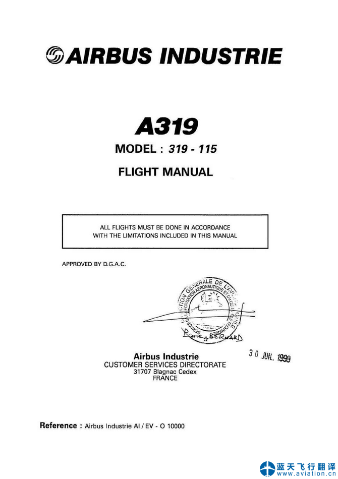 北京藍(lán)天飛行翻譯公司本次翻譯的ACJ319構(gòu)型為319-115,ACJ319飛行機(jī)組操作手冊(cè)和ACJ319快速檢查單修訂日期為2020年4月22日,ACJ319飛機(jī)飛行手冊(cè)修訂日期為2020年6月9日。