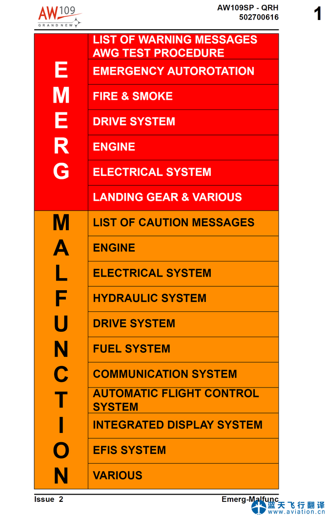 北京藍(lán)天飛行翻譯公司承接大型直升機(jī)公司的AW109直升機(jī)快速檢查單翻譯任務(wù) AW109 Quick Reference Handbook(QRH) Translation