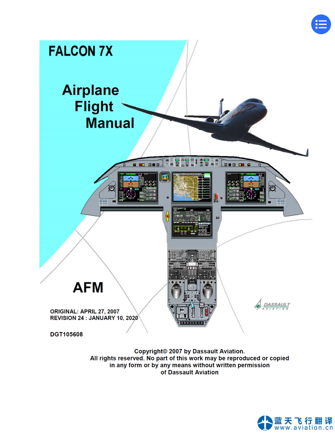 北京藍(lán)天飛行翻譯公司本次翻譯的達(dá)索獵鷹7X公務(wù)機(jī)飛機(jī)飛行手冊(cè)(Airplane Flight Manual)為第24版,版本日期為2020年1月10日。