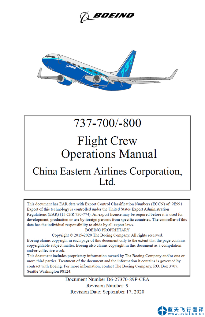 北京藍天飛行翻譯有限公司完成大型航空公司的2020年9月17日版本波音737-700/-800飛行機組使用手冊(Flight CrewOperations Manual FCOM)和快速檢查單(Quick Reference Handbook QRH)翻譯任務 737-700/-800 Flight CrewOperations Manual and Quick Reference Handbook Translation