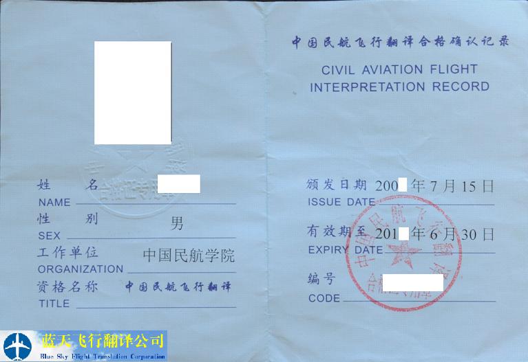 民航飛行翻譯合格證書(Certificate for civil aviation flight interpretation)(簡稱飛翻證)由中國民用航空總局統(tǒng)一印制,由飛行標(biāo)準(zhǔn)司頒發(fā)。它表明持證人通過飛行標(biāo)準(zhǔn)司組織的民航飛行翻譯考試且成績合格。 This certificate is printed by CAAC and issued by the Flight Standards Dept. of CAAC. It indicates that the carrier of this certificate has passed Civil Aviation Flight Interpretation Test organized by the Flight Standards Dept. of CAAC. 民航飛行翻譯合格證書 Certificate for civil aviation flight interpretation 中國民用航空總局 民航飛行翻譯合格證書1 Certificate for civil aviation flight interpretation 2 |