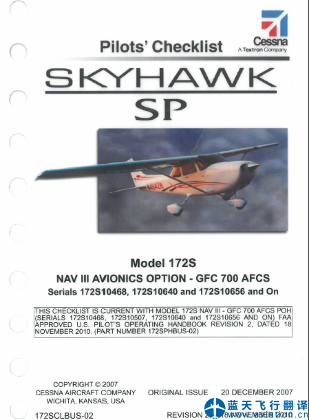 北京藍(lán)天飛行翻譯公司承接大型通航公司的塞斯納172S飛行員檢查單翻譯任務(wù) Cessna 172S Pilots' Checklist Translation ![]() 塞斯納172S飛行員檢查單 Cessna 172S Pilots' Checklist 塞斯納172S飛行員檢查單(Cessna 172S Pilots' Checklist)的主要內(nèi)容包含有: NORMAL PROCEDURES |