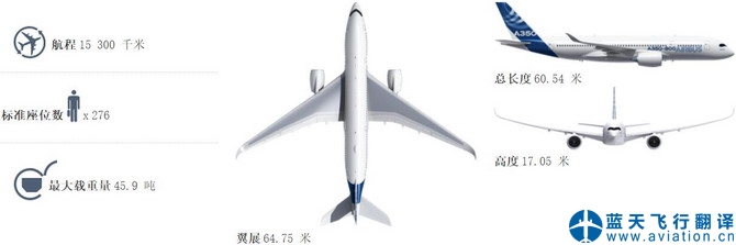 空中客車 A350-800 尺寸 總長(zhǎng)度 60.54 米 客艙長(zhǎng)度 -- 機(jī)身寬度 5.96 米 最大客艙寬度 5.61 米 翼展(幾何體) 64.75 米 高度 17.05 米 輪距 10.60 米 輪軸距 24.86 米 容量