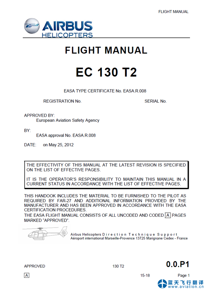 藍(lán)天飛行翻譯公司完成通用航空公司的空客EC130 T2飛行手冊翻譯任務(wù) AIRBUS HELICOPTERS EC 130 T2 FLIGHT MANUAL Translation