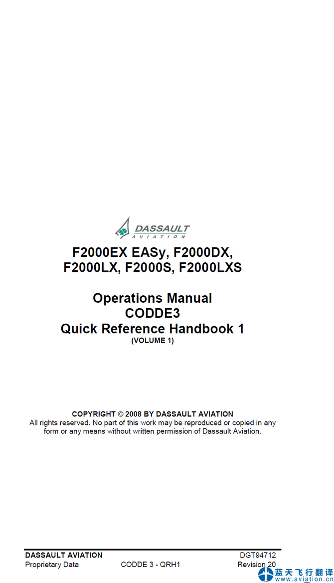 北京藍(lán)天飛行翻譯公司完成2016年4月15日版本達(dá)索獵鷹FALCON 2000飛行手冊翻譯 FALCON 2000 Flight Manual Translation CODDE(Crew Operational Documentation for Dassault EASy) REVISION 18 : April 15, 2016,機(jī)組使用手冊為第18版,2016年4月15日版本 QRH(Quick Reference Handbook) Revision 20 快速檢查單為第20版 AFM(Airplane Flight Manual) REVISION 20 : April 15, 2016 飛機(jī)飛行手冊為第20版,2016年4月15日版本 ![]() FALCON 2000 CODDE(Crew Operational Documentation for Dassault EASy) 達(dá)索獵鷹2000機(jī)組使用手冊 ![]() FALCON 2000 AFM(Airplane Flight Manual) 達(dá)索獵鷹2000飛機(jī)飛行手冊