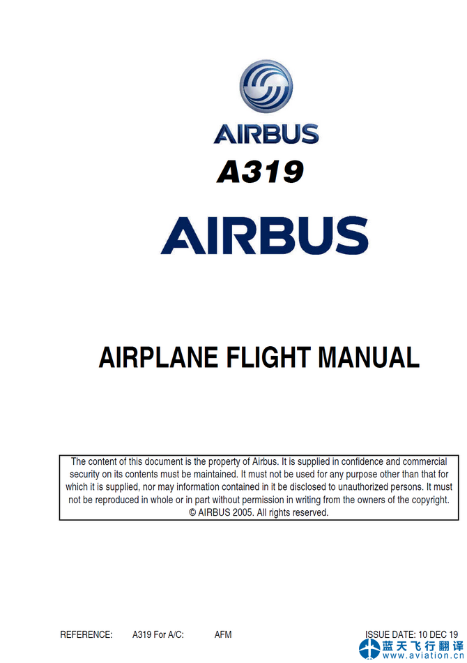 本次翻譯的ACJ319構(gòu)型為319-115,ACJ319飛行機(jī)組操作手冊(cè)和ACJ319快速檢查單修訂日期為2019年12月11日,ACJ319飛機(jī)飛行手冊(cè)修訂日期為2019年12月10日。